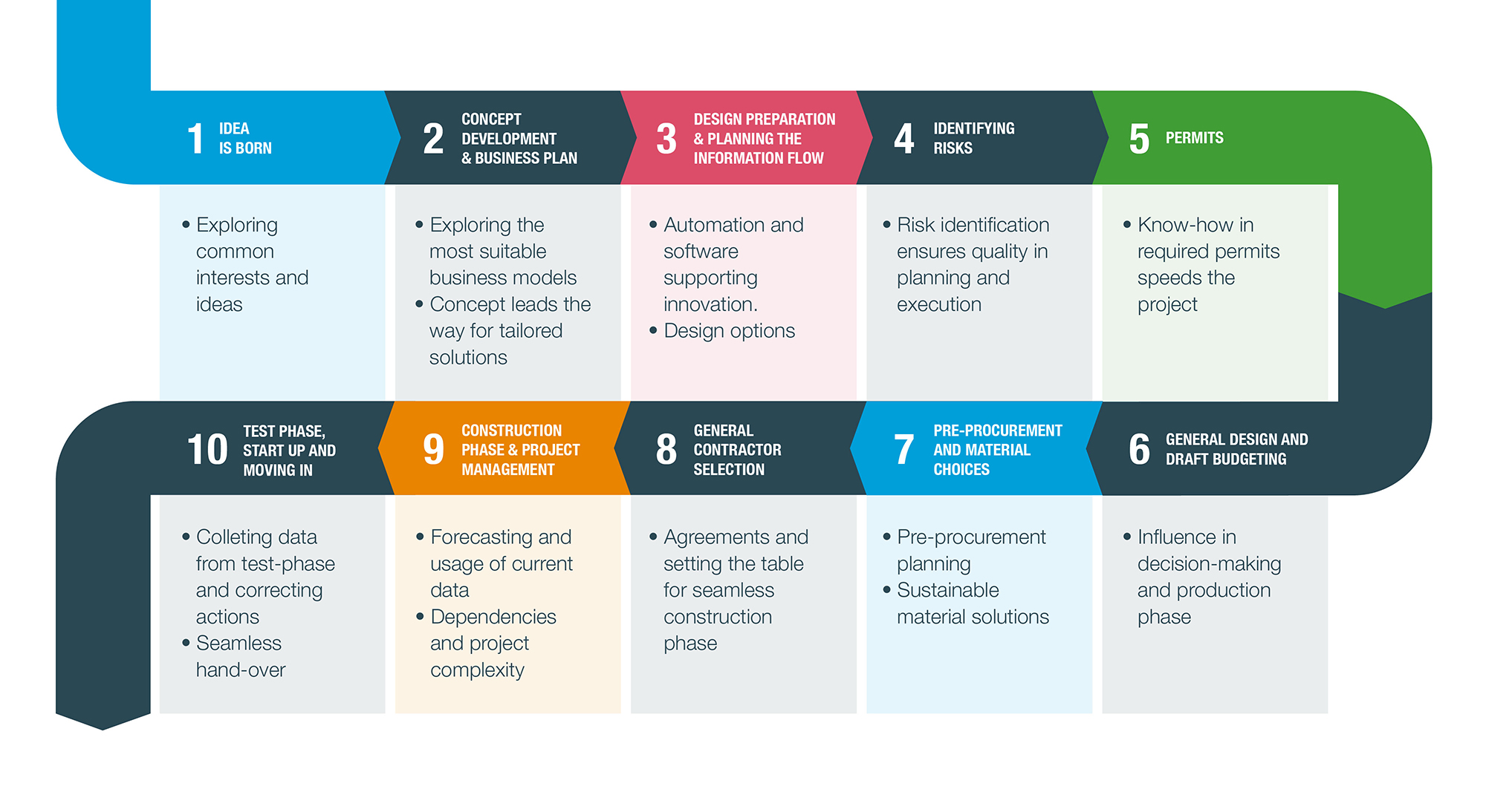 Every step from 1 to 10 is thought carefully among partners to ensure the best end-result and long-term business value. Innovation and smart solutions are created in cooperation. YIT’s expertise in leading complex construction projects is founded on strong know-how in customer and stakeholder management. Let’s create our unique journey together!