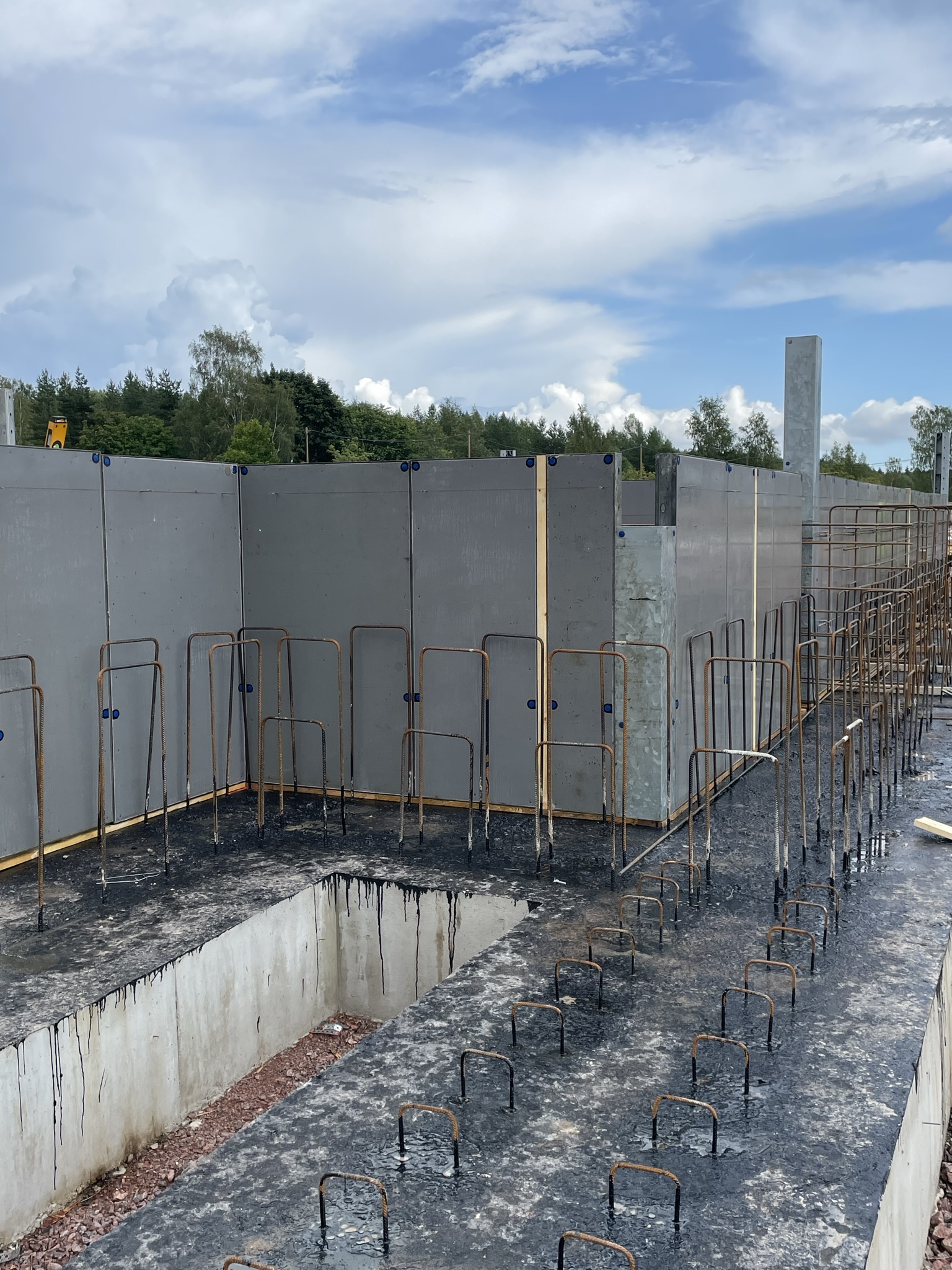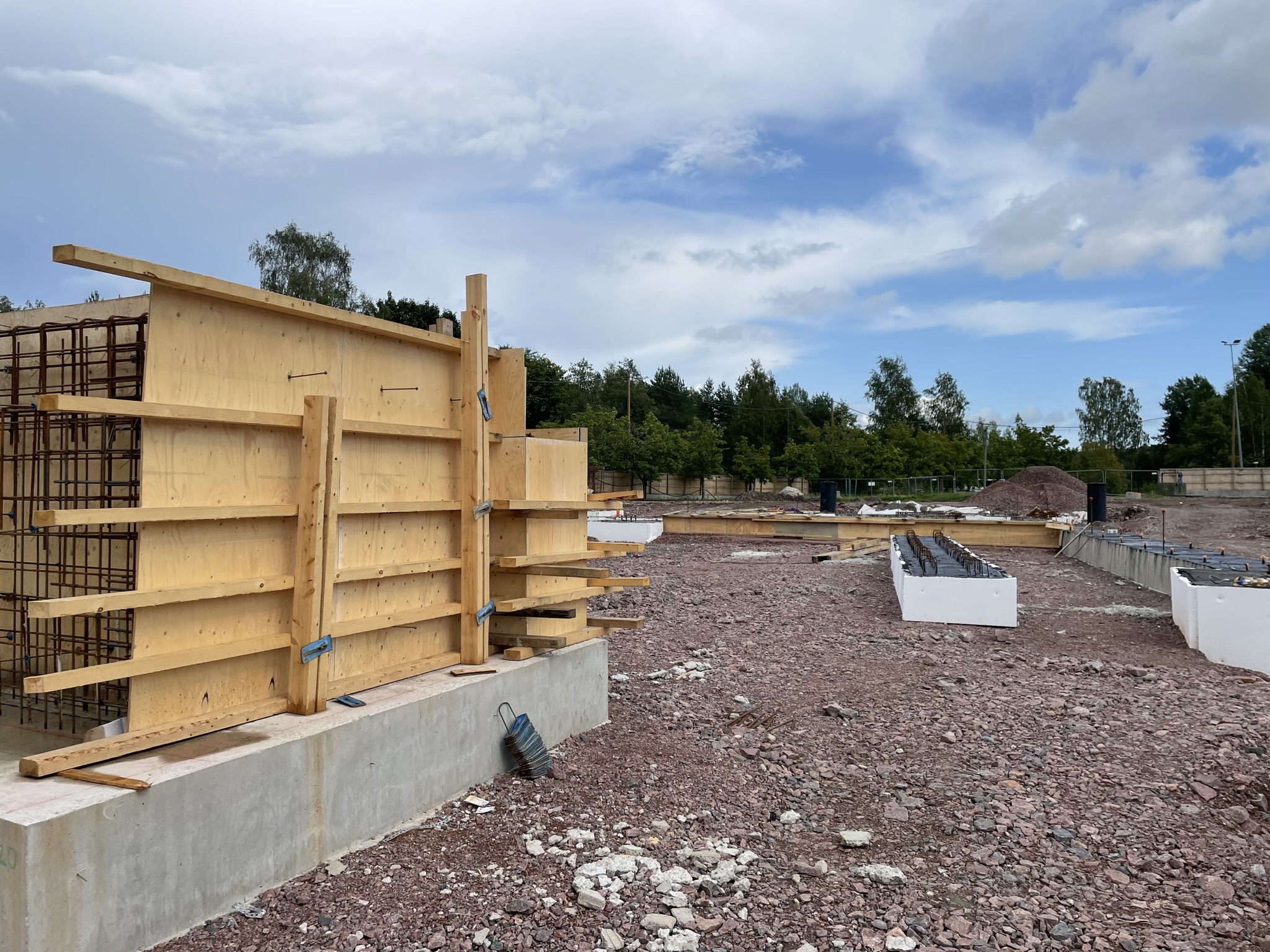 Inom jordbyggarbetet har bland annat grundplattor, dräneringar och påfyllningar gjorts. Rörledningarna för jordvärmebrunnarna har också påbörjats. Målet är att vi redan under byggfasen utnyttjar jordvärme för att värma upp den nya skolbyggnaden. Grundarbetsfasen fortsätter – armerings- och formarbeten har pågått på olika block. Under sommaren har vi gjutit varje vecka och takten fortsätter i samma spår.