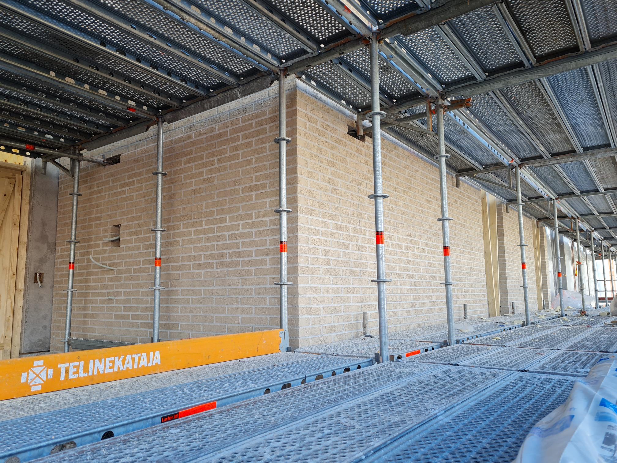 Sääsuojan alla vesikattotyöt, ikkuna-asennukset sekä julkisivun muuraustyöt ovat jo hyvässä vauhdissa.
