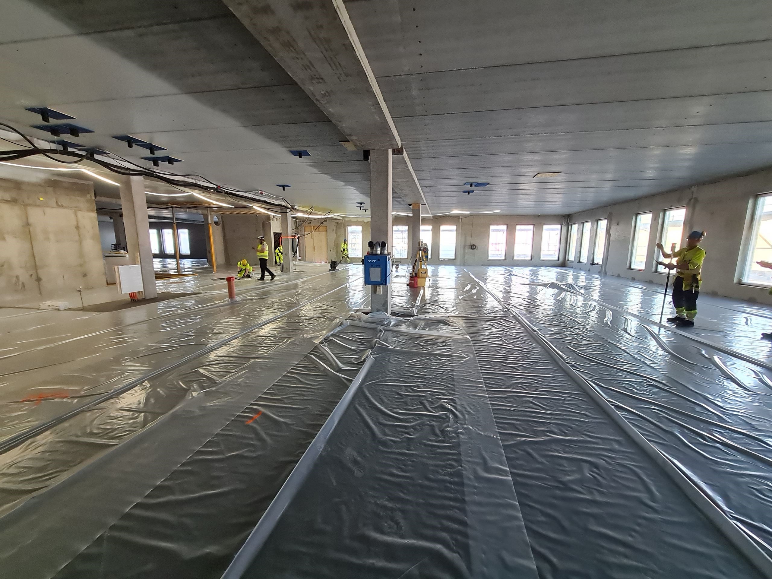 Sisäpuolen työtkin on saatu aluilleen. Pintalattioita on valettu ja väliseinätyöt ovat alkamassa. Nämä työvaiheet kestävät kokonaisuudessaan useita kuukausia ja lisäksi työmaan edetessä päästään myös muiden sisäpuolen työvaiheiden pariin.