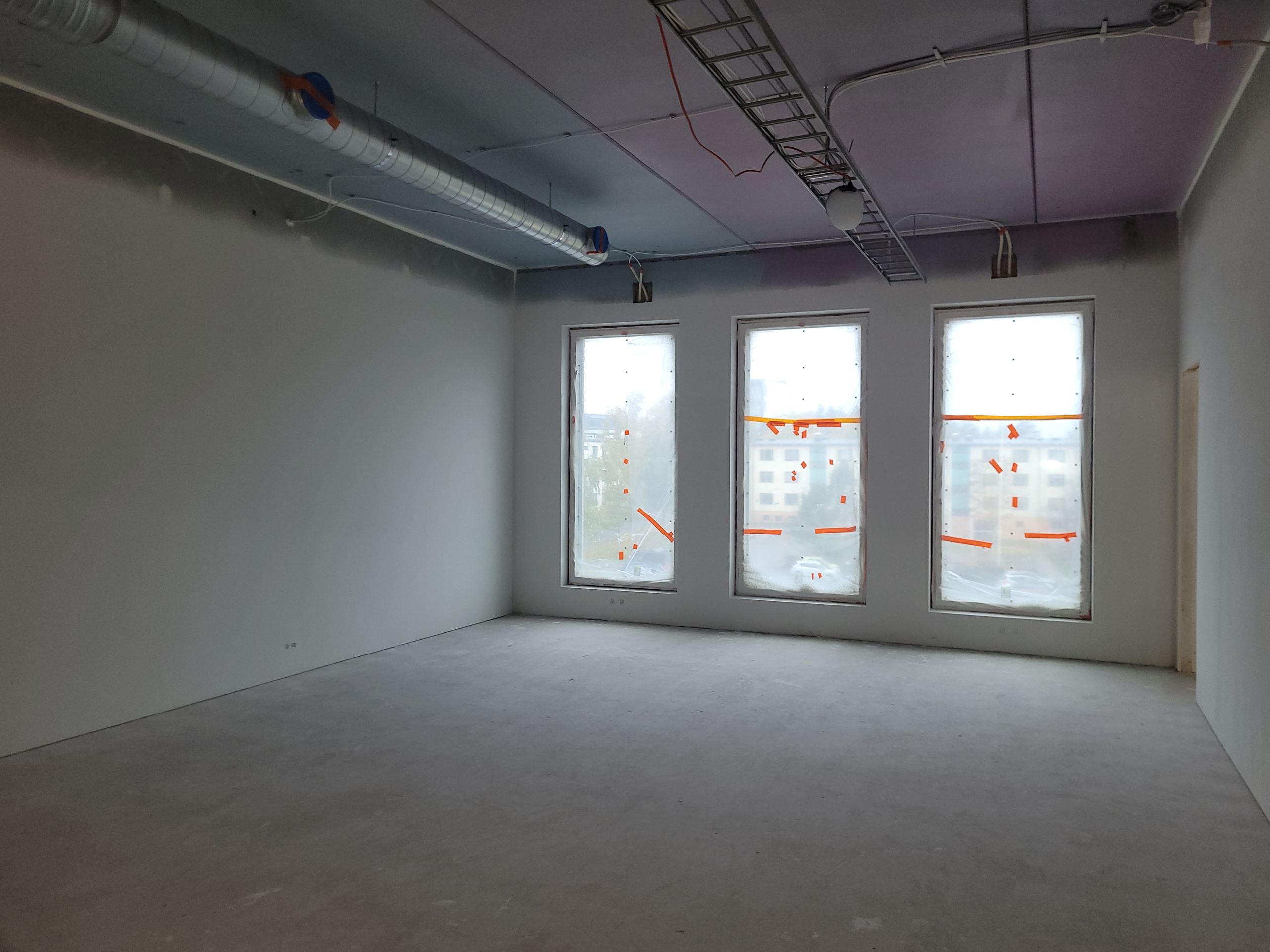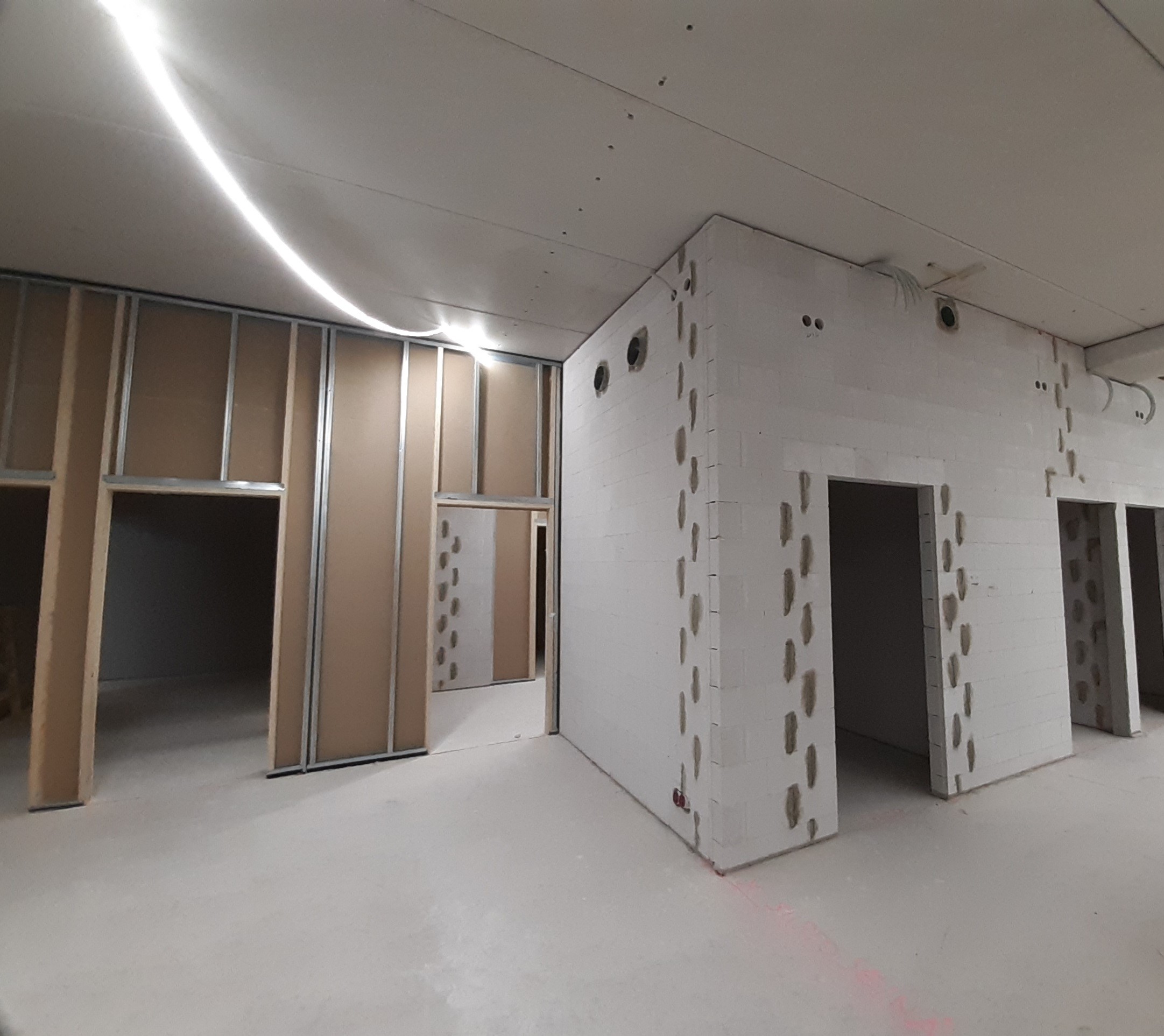 Sisäpuolen töissä edetään niin väliseinissä kuin ensimmäisellä lohkolla alkaneessa seinien tasoituksessa ja maalauksessa. Pian pääsemme myös aloittamaan alakattonrunkojen asennuksen.