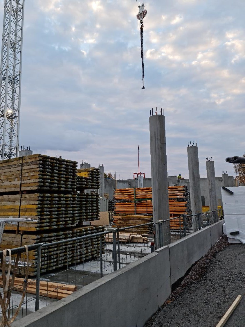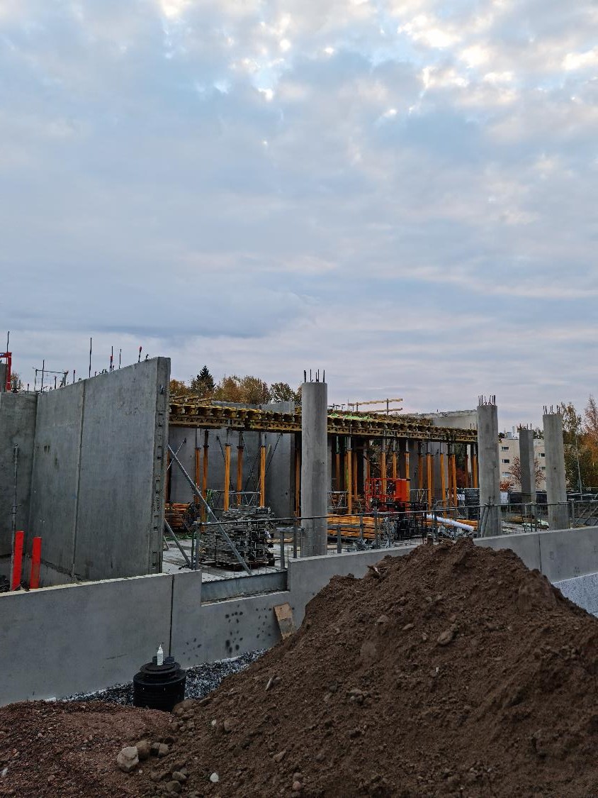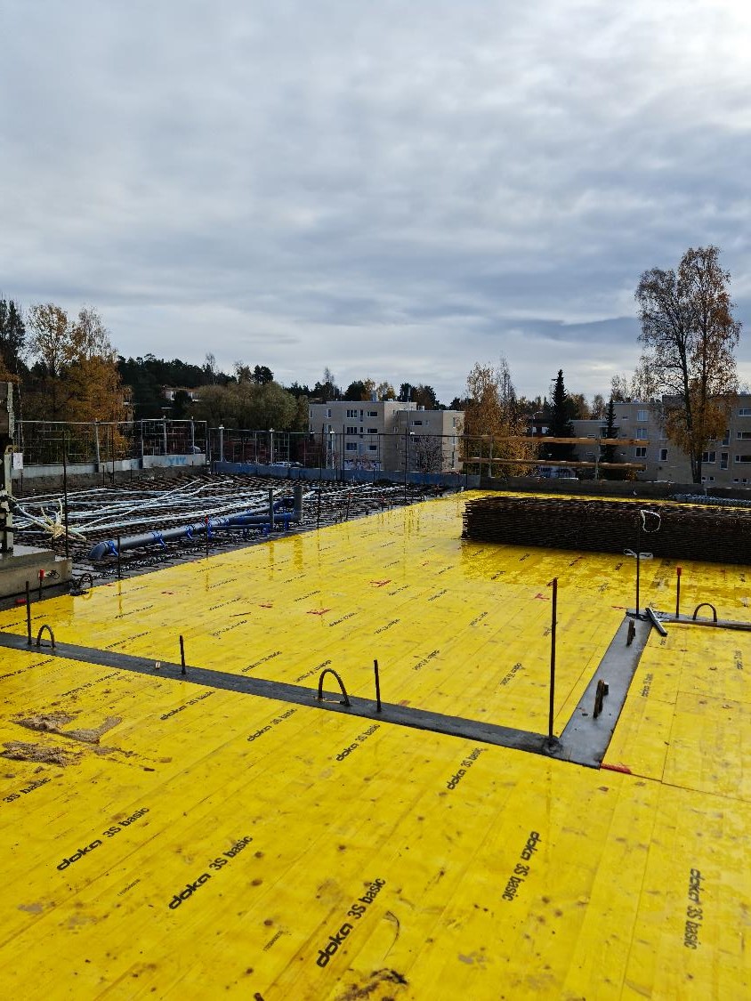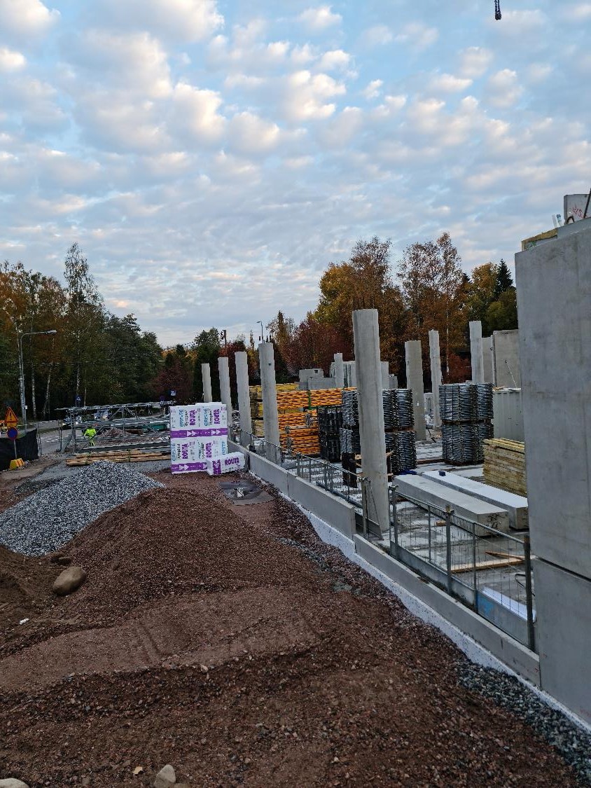 Ensimmäisen kerroksen elementit ovat pääosin asennettu ja tällä hetkellä käynnissä on myös toisen kerroksen välipohjan muotitustyöt.