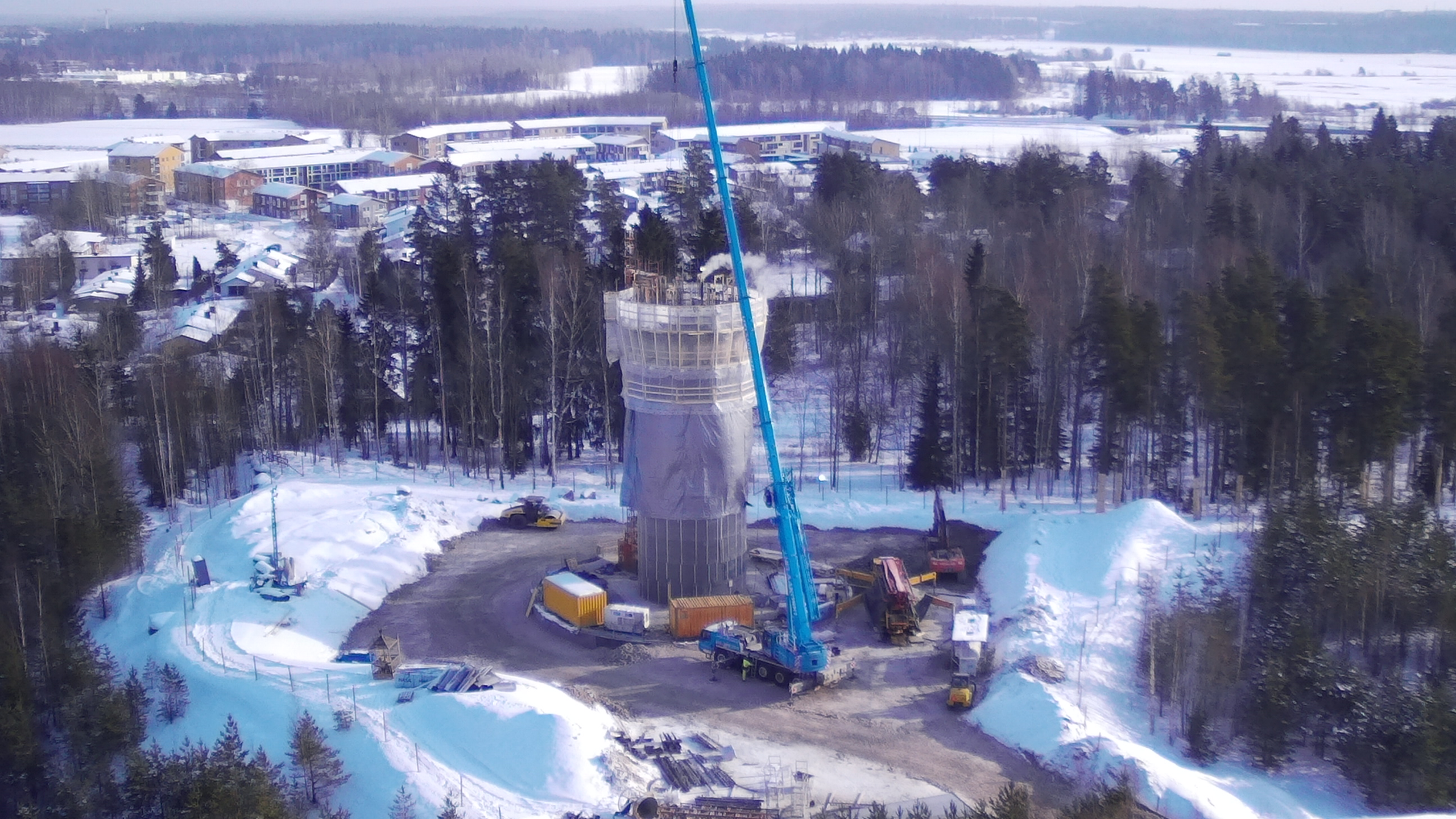 Vantaan Hiekkaharjun vesitornin liukuvalun toteutus kesti noin pari viikkoa. Vesitorni nousee 47 metrin korkeuteen. Varren halkaisija on 8,7 m ja vesitorni on yksi suurimmista vesitorneista Suomessa. © HSY